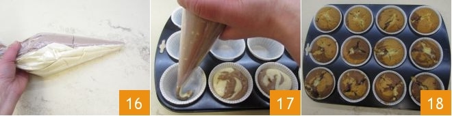 para obter um efeito mesclado, insira, por sua vez, os dois sacos de confeitar em um saco de confeitar maior 16, faça um corte na ponta e despeje a massa em uma forma para 12 muffins forrada com forminhas de papel, a massa deve chegar até a borda 17. Asse os muffins em forno estático a 180°C por 30 minutos (ou em forno ventilado a 160°C por 20 minutos). Após o cozimento, retire seus muffins de cacau mesclados com gotas de chocolate branco e deixe-os amornar antes de saboreá-los 18.