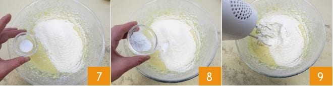 o bicarbonato 7 e o fermento 8. Misture com a batedeira 9 para obter uma massa sem grumos.