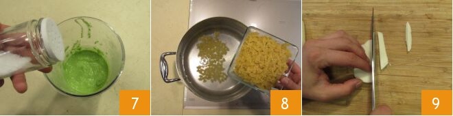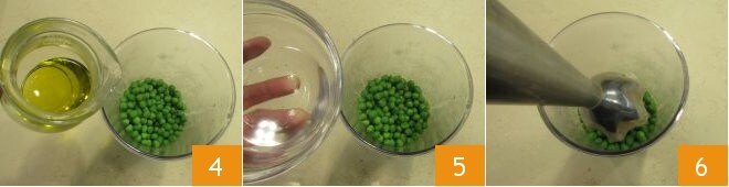 e coloque-as em um copo alto, adicione o azeite de oliva 4 e a água de cozimento que você reservou 5, bata a mistura com um mixer de imersão 6 para obter um creme.