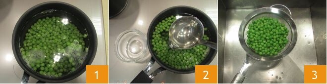 Para preparar as múmias de massa, comece cozinhando as ervilhas por cerca de 4 minutos 1. Coloque no fogo uma panela cheia de água para salgar ao ferver, que será usada para cozinhar a massa. Antes que as ervilhas estejam cozidas, retire uma concha de água de cozimento das ervilhas (cerca de 40 g) e reserve em uma tigela pequena 2. Após o tempo de cozimento das ervilhas, escorra-as 3