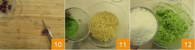 Corte as azeitonas ao meio para fazer os olhinhos 10. Escorra as mini farfalle, coloque-as em uma tigela e tempere com o pesto de ervilhas 11, tempere com o Parmesão ralado 12.