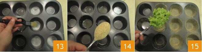 Pincele com azeite uma forma de muffin 13, cubra o fundo e as bordas de 8 forminhas com farinha de rosca 14 e preencha com uma colher e meia de massa 15.