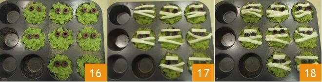 Coloque as rodelas de azeitona sobre as cestinhas de massa para simular os olhinhos 16. Asse em forno pré-aquecido a 200°, por 10 minutos. Após os 10 minutos, adicione as tiras de queijo não perfeitamente alinhadas para criar as faixas 17 e asse novamente por apenas 2 minutos, o tempo necessário para o queijo derreter. Depois de assadas, retire suas múmias de massa do forno e sirva-as bem quentes 18.