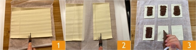 Para preparar as múmias de Nutella e bananas, a primeira coisa a fazer é desenrolar a massa folhada retangular sobre uma superfície de trabalho. Agora, corte 6 retângulos grandes de 10x5 cm 1 e com o restante da massa corte tiras de cerca de 1 cm de espessura 2. Com a ajuda de um saco de confeiteiro, distribua a Nutella nos retângulos, deixando uma borda livre 3.