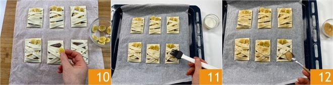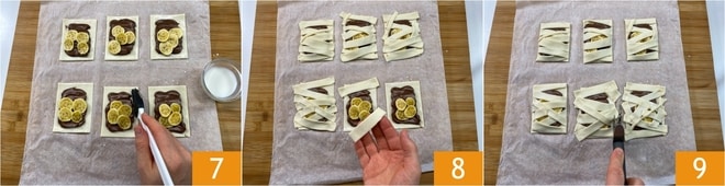 Pincele as bordas com um pouco de leite 7 e cubra com mais tiras para formar as múmias 8. Corte as bordas se as tiras saírem muito 9.