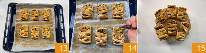 Asse em forno estático pré-aquecido a 200° por cerca de 20 minutos. Quando estiverem bem douradas, retire do forno 13 e deixe esfriar alguns minutos antes de fazer os olhinhos. Para isso, basta espremer um ponto de Nutella sobre as bananas 14 e adicionar uma gota de chocolate por cima. Continue assim para todas e suas múmias estão prontas 15!