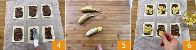 Espalhe a Nutella com uma espátula para uniformizar 4, depois descasque as bananas e corte-as em fatias finas 5. Distribua sobre a Nutella 3-4 fatias de banana deixando uma faixa superior livre 6.