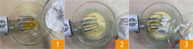 Para preparar a naked cake com panetone comece pelo creme: em uma tigela coloque os ovos e o açúcar de confeiteiro 1, depois misture os ingredientes com a batedeira. Em seguida, adicione a ricota 2 e o mascarpone 3.