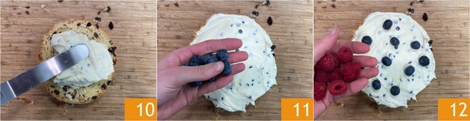 Recheie a primeira fatia com o creme 10, adicionando alguns mirtilos 11 e framboesas 12. Cubra com a segunda fatia e continue assim até recompor o panetone.
