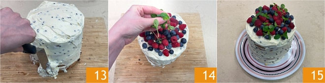 Finalmente, cubra o exterior com o creme restante 13 e decore a superfície com mirtilos, framboesas e algumas folhas de hortelã 14. Sua naked cake com panetone está pronta para ser servida 15!
