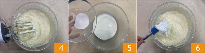 Continue a trabalhar até obter um creme espumoso e homogêneo 4. Em outra tigela coloque o creme de leite, adicione o estabilizante 5 e bata. Incorpore o chantilly à mistura de ricota e mascarpone 6 mexendo de baixo para cima para não desmontá-los.