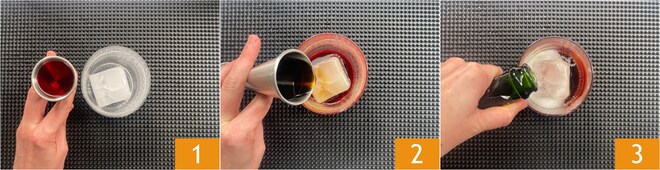 Para preparar o Negroni sbagliato, como primeira coisa coloque um cubo de gelo dentro de um copo baixo. Despeje o bitter vermelho 1, o vermute tinto 2 e uma parte do prosecco 3.