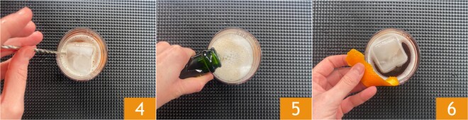 Misture rapidamente com uma colher de bar, com movimentos de baixo para cima 4. Despeje a outra parte do prosecco até que a espuma toque a borda do copo 5. Passe uma zest de laranja na borda do copo 6 e mergulhe-a no coquetel como guarnição. Seu Negroni sbagliato está pronto para ser apreciado!
