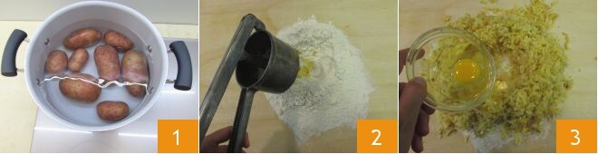 Para preparar os gnocchi ao gorgonzola, comece cozinhando as batatas: em uma panela grande, coloque as batatas e cubra com bastante água fria 1. A partir do momento em que a água ferver, conte cerca de 30-40 minutos, dependendo do tamanho; faça o teste com um garfo e se os dentes entrarem sem dificuldade no meio, então você poderá escorrer. Descasque-as ainda quentes e amasse sobre a farinha que você terá despejado sobre a bancada 2. Depois, adicione o ovo levemente batido junto com uma pitada de sal 3.