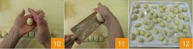 Role o pedacinho delicadamente entre as mãos como uma almôndega para dar uma forma arredondada 10, adicione um pouco de farinha se a massa estiver pegajosa. Finalmente, passe os gnocchi um a um sobre o marcador de gnocchi 11 que dará a clássica estriagem que caracteriza esta massa. Coloque os gnocchi bem espaçados sobre uma bandeja enfarinhada 12. Enquanto isso, coloque no fogo uma panela cheia de água a ferver com sal, para o cozimento dos gnocchi.