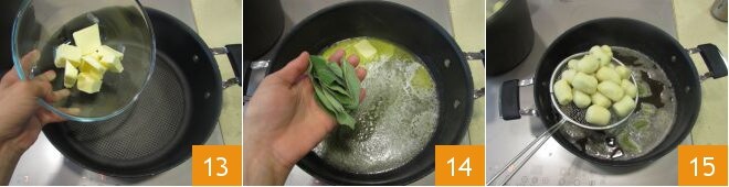 Prepare o molho: coloque a manteiga em uma panela 13 e derreta com algumas folhas de sálvia 14. Cozinhe os gnocchi em bastante água salgada 15.