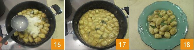 Quando os gnocchi começarem a emergir na superfície, escorra com a ajuda de uma escumadeira e coloque-os na panela com o molho, desligue o fogo e adicione o queijo ralado e uma concha de água de cozimento 16 para deixá-los mais cremosos. Salteie os seus gnocchi ao gorgonzola misturando tudo 17 e sirva-os bem quentes 18.