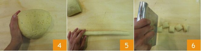 Amassar tudo com as mãos até obter uma massa macia, mas compacta 4. Lembre-se de que se forem trabalhados demais, os gnocchi ficarão duros durante o cozimento, portanto, limite-se a amassar o necessário. Faça rolinhos da massa com cerca de 3 cm de diâmetro 5, com a ajuda de uma espátula, corte em pedacinhos de 2 cm de espessura 6.