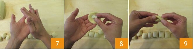 Aperte os pedacinhos com os dedos para obter pequenos círculos de massa 7. Coloque no centro do círculo um pequeno cubo de gorgonzola 8, depois feche a massa 9.