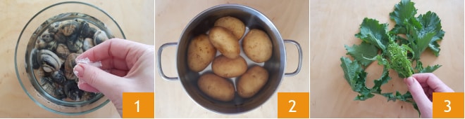 Para preparar os nhoques com amêijoas e folhas de nabo, primeiro coloque as amêijoas para purgar em uma tigela com água e sal 1. Enquanto isso, cozinhe as batatas 2 por cerca de 30-40 minutos, até que estejam macias. O tempo pode variar de acordo com o tamanho das batatas. Limpe as folhas de nabo removendo as folhas maiores 3.