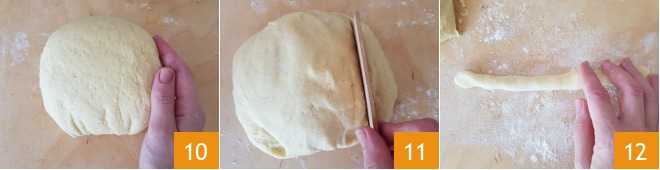 Forme um bloco 10, corte um pedaço da massa com uma espátula ou faca 11 e modele um rolo com cerca de 1,5 cm de espessura 12.