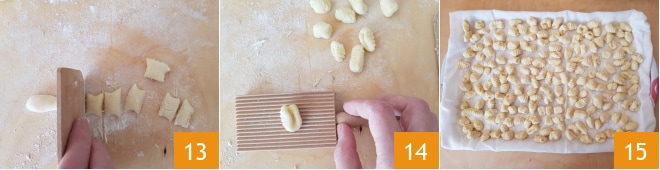 Corte os rolos em pedaços pequenos 13 e, pressionando levemente em um modelador de nhoque, forme os nhoques 14, se não tiver um modelador, você pode usar os dentes de um garfo. À medida que formar os nhoques, coloque-os em uma bandeja coberta com um pano enfarinhado 15.
