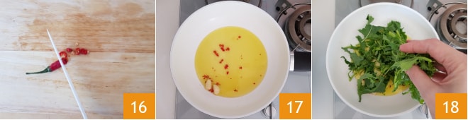 Pique uma pimenta 16, depois numa frigideira aqueça o óleo com o alho e a pimenta 17. Adicione as folhas de nabo 18 e deixe murchar em fogo médio.