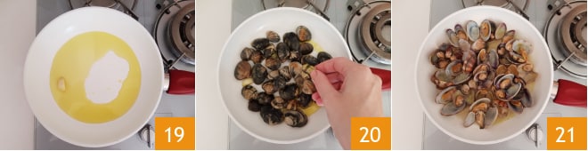 Enquanto isso, em outra frigideira aqueça o óleo com o alho 19, adicione as amêijoas purgadas e enxaguadas 20, cubra com a tampa e cozinhe por 5-6 minutos ou até que se abram 21.