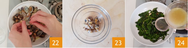 Coloque no fogão uma panela grande cheia de água salgada e leve à fervura, será usada para cozinhar os nhoques. Descasque apenas ¾ das amêijoas 22 e coloque-as em uma tigela 23. Coe a água do cozimento das amêijoas vertendo-a diretamente sobre os vegetais 24 para dar sabor.