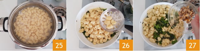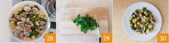 Cozinhe os nhoques por poucos minutos 25, apenas o tempo necessário para subirem à superfície. Uma vez cozidos, escorra-os na frigideira com o tempero 26, adicione também as amêijoas descascadas 27