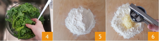 Enxágue os brotos em água corrente 4 e depois deixe escorrer. Passe agora para a preparação dos nhoques: coloque a farinha em forma de vulcão sobre uma superfície 5, pegue as batatas cozidas e passe-as pelo espremedor de batatas sem descascá-las, ainda quentes 6.