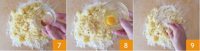 Adicione sal, pimenta 7, coloque o ovo 8 e misture rapidamente com as mãos 9 para incorporar todos os ingredientes.