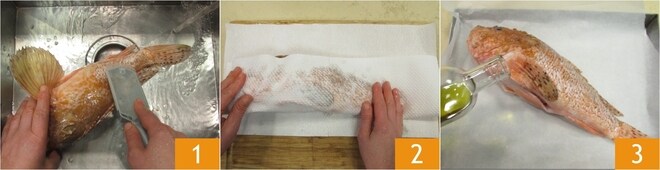 Para preparar os nhoques com ragu de tamboril e bottarga, primeiro prepare o peixe: remova as escamas sob água fria corrente usando o utensílio apropriado ou uma faca 1, depois seque bem 2 e retire as vísceras. Transfira o tamboril inteiro para uma assadeira forrada com papel manteiga e tempere com azeite de oliva 3.