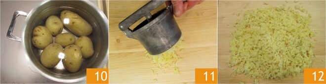 Enquanto isso, coloque as batatas em uma panela com água fria, sem retirar a casca 10. Leve à fervura e cozinhe por 20-25 minutos, até que consiga espetá-las facilmente com um garfo. Uma vez cozidas, amasse-as com um espremedor de batatas sobre uma superfície 11 e deixe secar ao ar por 2-3 minutos 12.