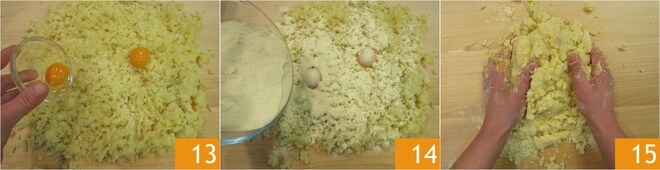 Agora adicione as gemas 13 e cubra tudo com a farinha de sêmola 14, depois amasse com as mãos até obter uma massa homogênea 15.