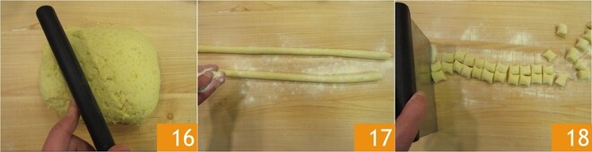 Divida a massa em porções menores 16, forme rolinhos 17 e corte-os em pedaços de cerca de 2 cm usando uma espátula 18. Transfira os nhoques para um pano enfarinhado e reserve.