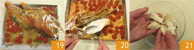 Após o tempo de cozimento do tamboril 19, retire do forno e limpe o peixe, separando apenas a polpa 20. Transfira-a para uma tigela e desfie com as mãos, certificando-se de que não haja espinhas 21.