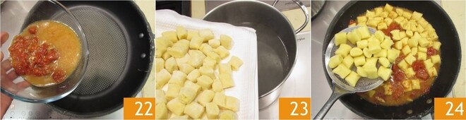 Despeje os tomatinhos junto com a água de cozimento do tamboril em uma frigideira grande 22. Enquanto isso, leve uma panela de água salgada para ferver e cozinhe os nhoques por alguns minutos 23. Quando subirem à superfície, escorra-os diretamente na frigideira 24.