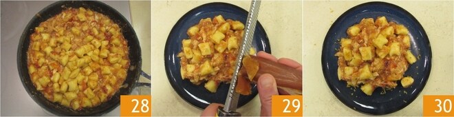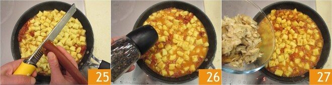 Adicione uma generosa quantidade de bottarga ralada 25 e refogue em fogo alto para reduzir o molho. Apimente 26 e acrescente a polpa do tamboril, com o fogo já apagado 27.