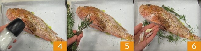 Salgue 4 e apimente, em seguida adicione os raminhos de alecrim 5 e os dentes de alho com casca 6.