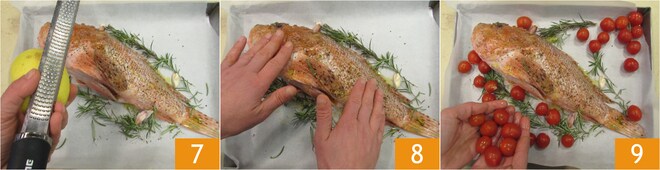 Perfume com a casca de limão ralada 7 e massageie bem com as mãos para que os aromas sejam absorvidos 8. Finalmente, distribua os tomatinhos na assadeira 9 e asse a 165°C por 25 minutos no forno com função 50% vapor. Alternativamente, você pode usar o forno estático e assar a 150°C por 45 minutos.