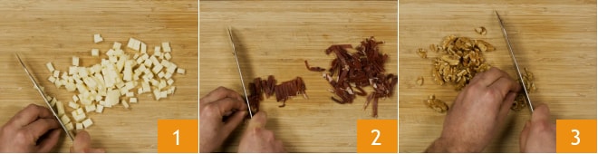 Para preparar os nhoques speck e toma, comece colocando a panela com água no fogo para cozinhar a massa. Enquanto isso, corte o toma em cubos 1. Em seguida, enrole as fatias de speck e corte-as em tiras finas 2. Por fim, pique grosseiramente os miolos das nozes 3.