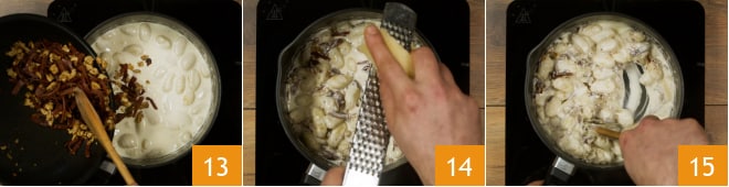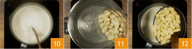 Derreta o queijo mexendo continuamente 10. Neste ponto, você pode salgar a água fervente e mergulhar os nhoques 11. Assim que eles flutuarem, escorra-os direto no creme 12.