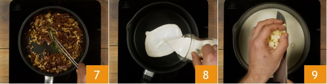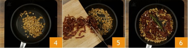 Vá para o fogão e coloque as nozes em uma frigideira antiaderente junto com 4 o speck 5 e depois o ramo de alecrim 6.