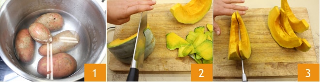 Para preparar os nhoques de abóbora com Grana Padano, repolho roxo e speck, comece fervendo as batatas em água salgada abundante por 30-40 minutos, dependendo do tamanho delas 1: elas devem ficar macias mas não se desmanchar, para não absorver muita água. Você pode testar o cozimento espetando-as com os dentes de um garfo; se conseguir facilmente perfurá-las, significa que estão cozidas. Se preferir, você também pode optar por assar as batatas no forno inteiras e com casca, para que percam o excesso de água e depois esvaziá-las com uma colher para obter a polpa útil para a receita. Você pode deixá-las esfriar após estarem prontas. Enquanto as batatas cozinham, pegue a abóbora, retire as sementes e a casca 2 e corte em fatias 3. Coloque-as em uma assadeira forrada com papel manteiga. Asse em forno ventilado a 180°C por 20 minutos até que comecem a secar ligeiramente. A abóbora, assim, ficará seca e não soltará água durante a preparação dos nhoques (você obterá cerca de 350 g de abóbora cozida).