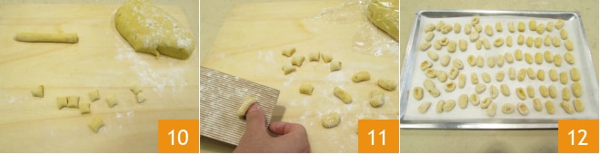 Retire uma porção de massa e forme um rolinho, corte-o em pequenos pedaços de cerca de 1,5-2 cm 10. Repita a operação até terminar toda a massa. Passe agora os nhoques um a um nos dentes de um garfo, ou no modelador de nhoques, para dar as típicas estrias 11. Disponha os nhoques em um pano enfarinhado 12.