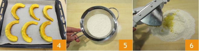 Após o tempo necessário, desligue o forno e retire a abóbora 4. Peneire a farinha sobre uma superfície 5, amasse as batatas no meio criando um buraco na farinha 6.