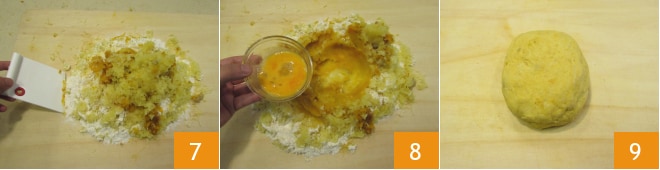 Passe também a abóbora no espremedor e coloque o purê sobre a massa 7. Adicione o ovo 8, o sal e amasse até obter uma massa compacta 9.