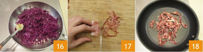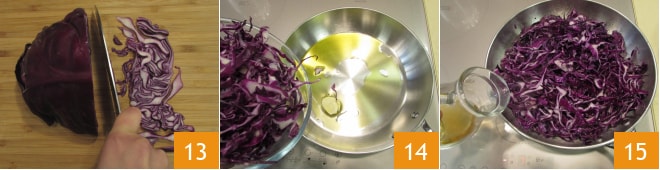 Corte finamente o repolho roxo 13. Em uma frigideira, aqueça um fio de óleo com um dente de alho, em seguida adicione o repolho 14 e cozinhe por cerca de 5 minutos. Adicione o vinagre 15 e deixe evaporar.