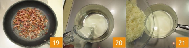 Tempo suficiente para deixá-lo crocante 19. Enquanto isso, coloque uma panela cheia de água no fogo e adicione sal quando estiver fervendo; será usada para cozinhar os nhoques. Enquanto a água ferve, prepare o molho de Grana: aqueça o creme de leite em uma panela pequena 20, em seguida adicione o Grana Padano DOP ralado 21. Cozinhe em fogo médio, mexendo até que o queijo esteja completamente derretido.